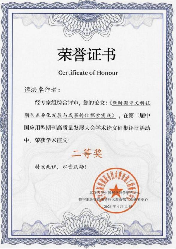 同時,院刊副主編、編輯部主任譚洪卓研究員撰寫的《新時期中文科技期刊差異化發(fā)展與成果轉(zhuǎn)化探索實(shí)踐——以〈糧油食品科技〉特色路徑為例》一文,在本次大會學(xué)術(shù)論文征集評比活動中獲二等獎。